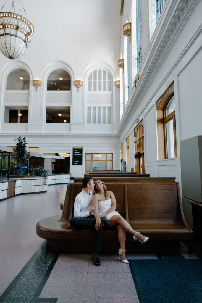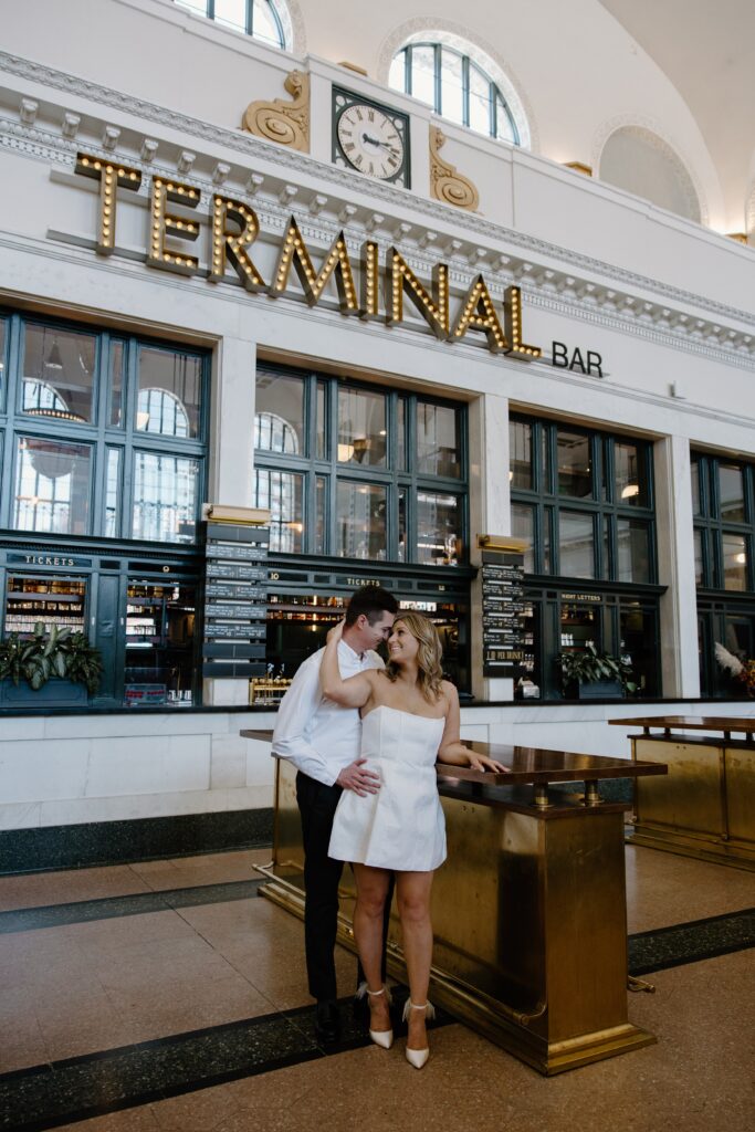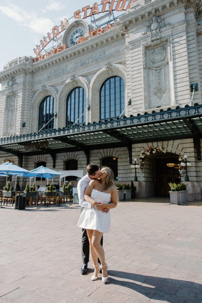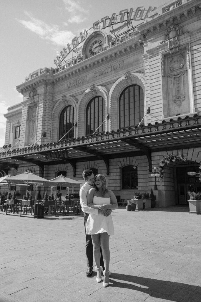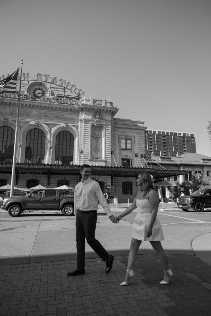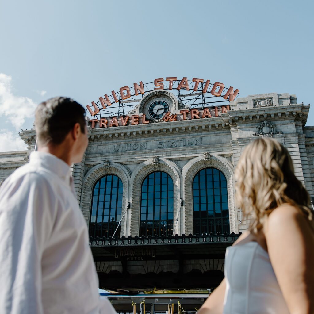 From there, we made our way to Union Station, where the energy of the city really came to life. This part of their Denver engagement session brought in movement, architecture, and a deeper layer of meaning tied to their story.
