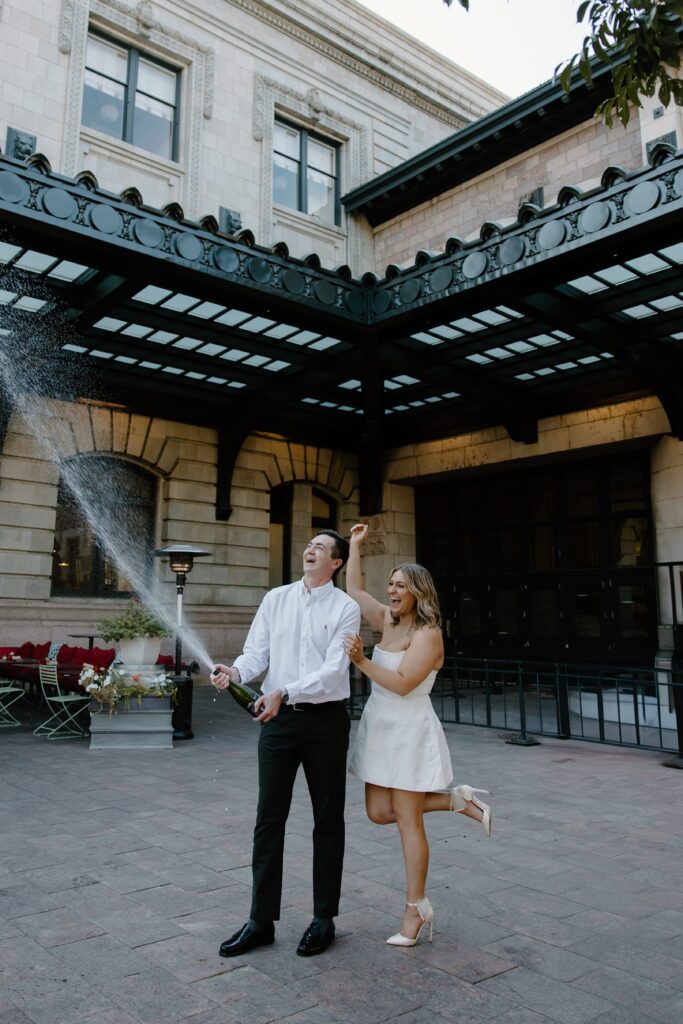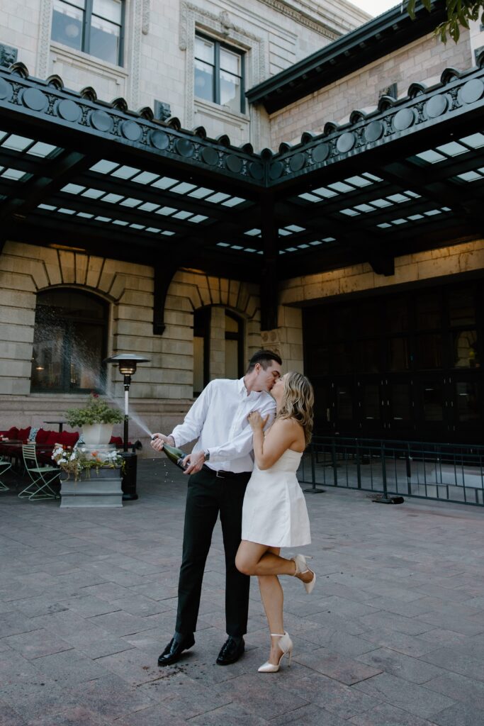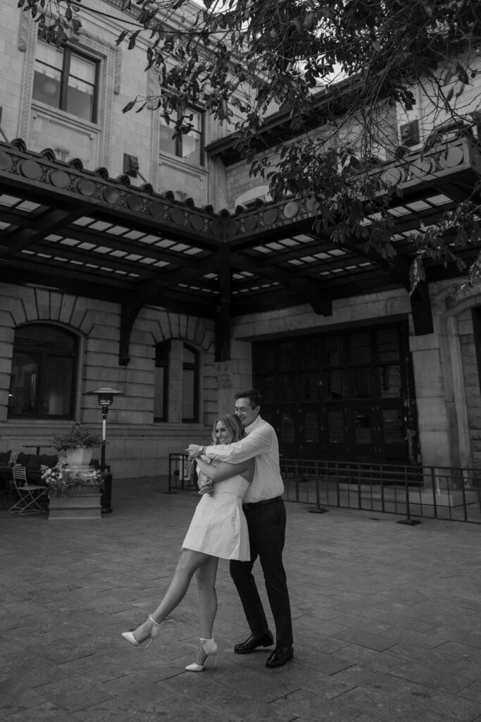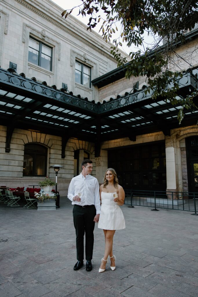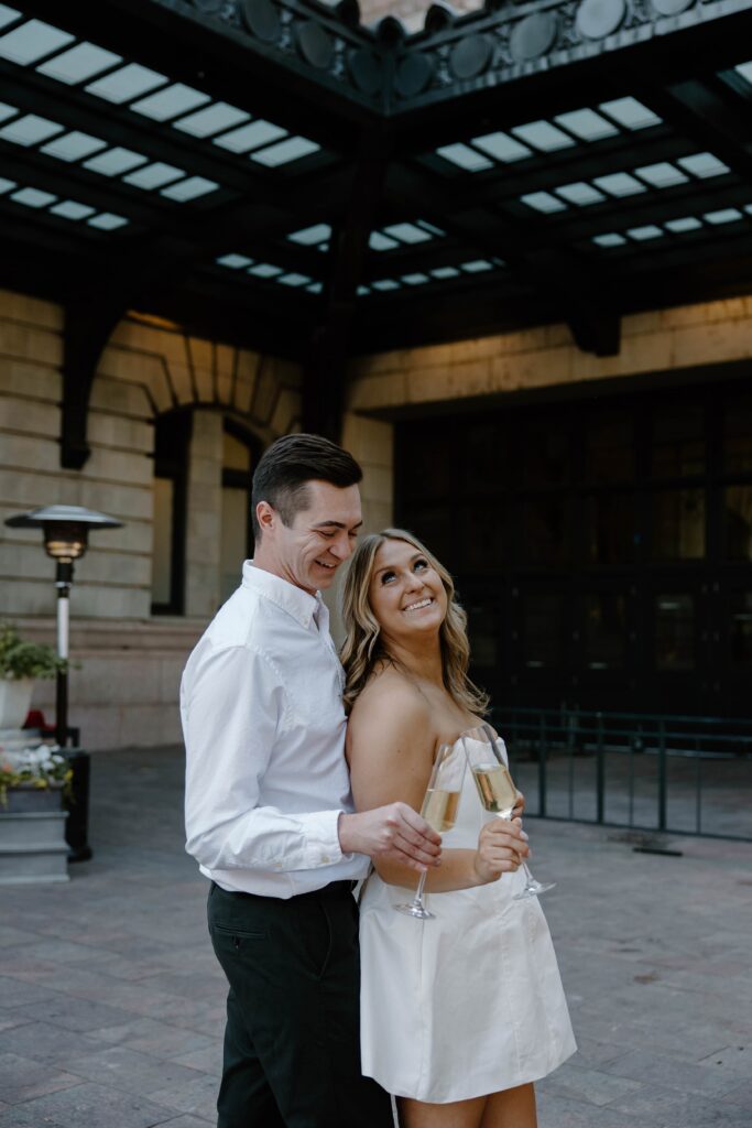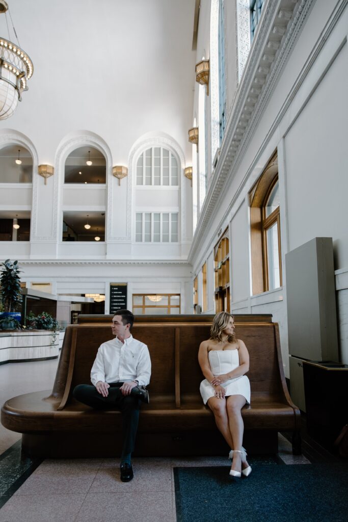 From there, we made our way to Union Station, where the energy of the city really came to life. This part of their Denver engagement session brought in movement, architecture, and a deeper layer of meaning tied to their story.