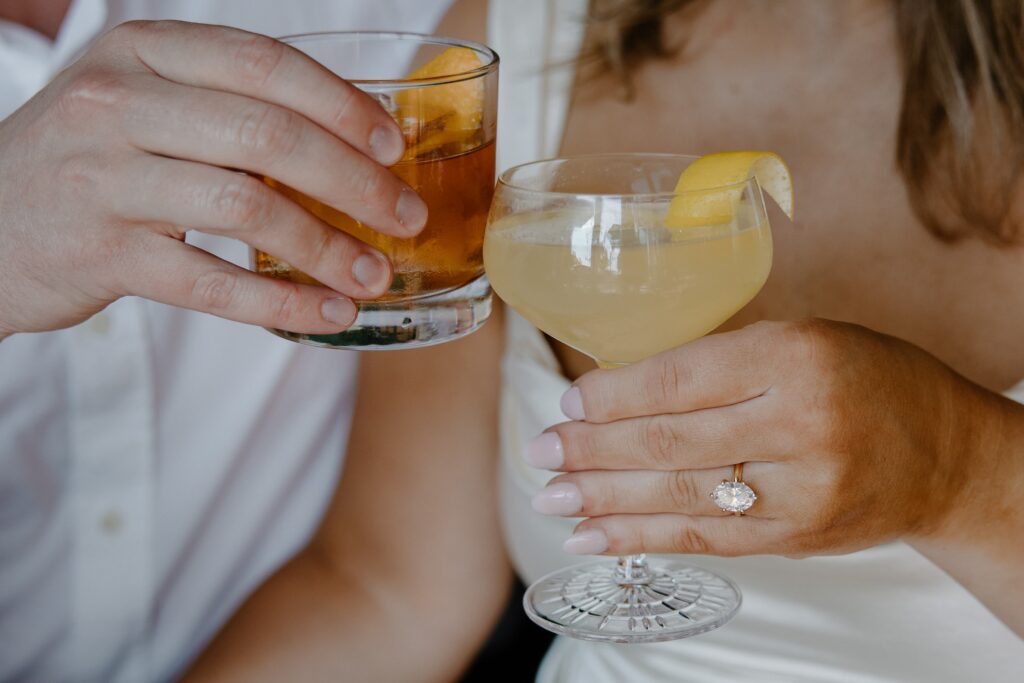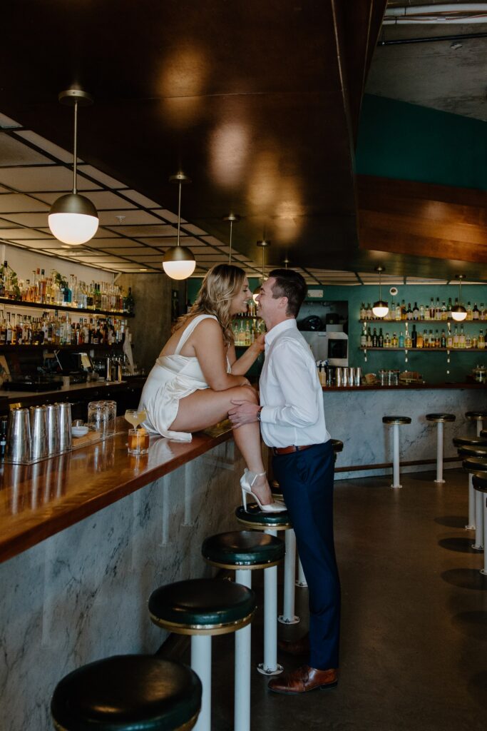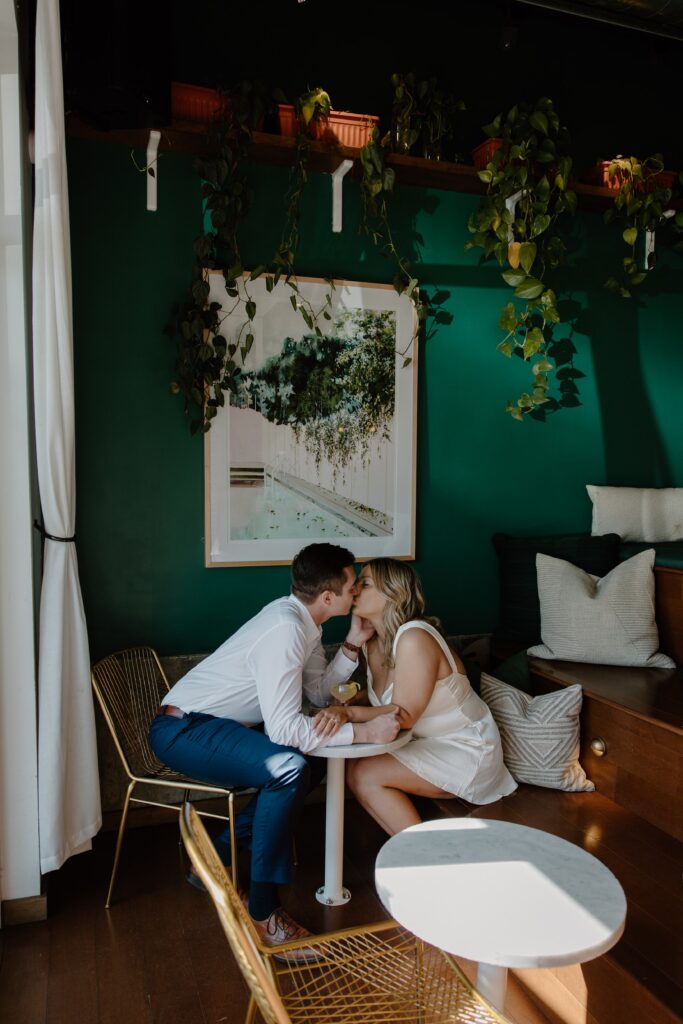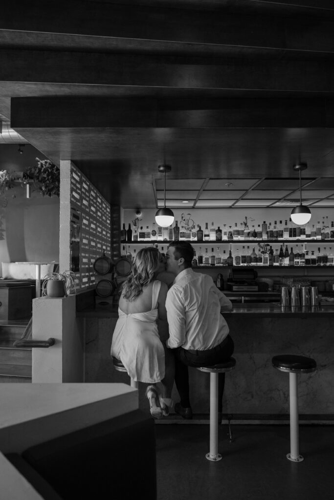 There’s something about beginning a session in a space that already holds memories. Whether it’s your go-to bar, coffee shop, or neighborhood hangout, it allows you to ease in naturally. Instead of feeling posed, you’re simply existing together, grabbing a drink, laughing, and settling into the moment. For M and J, this part of their Denver engagement session felt effortless. It reflected their everyday connection, the kind built on shared routines and time spent just being together.